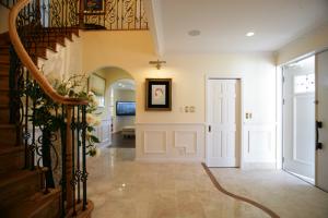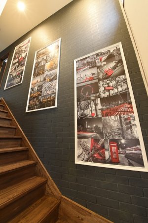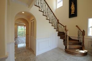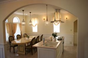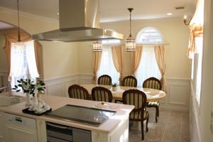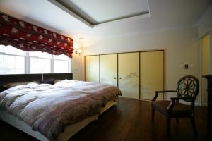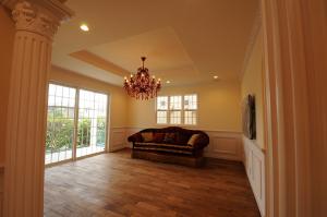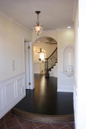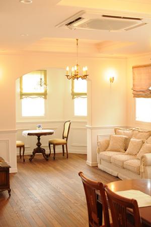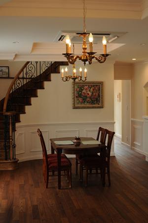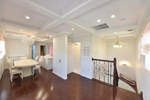二世帯住宅への建て替えです。玄関まわりは重厚なモールドで囲み、厳かにお出迎えしてくれます。室内は輸入クロスを絵画の様にフレームで囲み、遊び心溢れる雰囲気です。