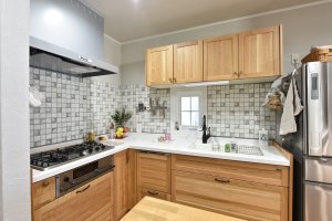 キッチンの背面の壁や玄関の手洗いなど、オーダーのタイルを使用し、細部までこだわり抜いたおうちです!